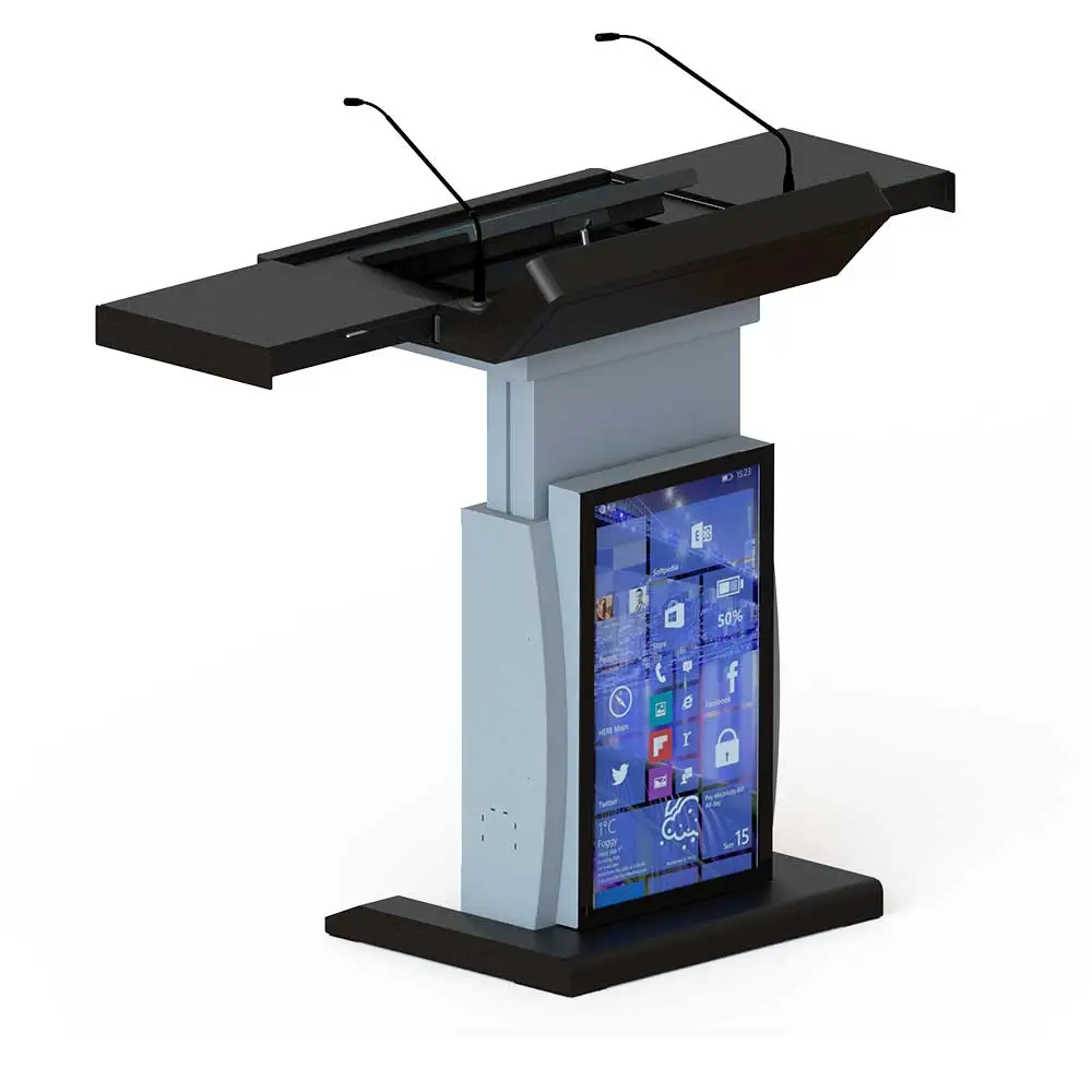 O: Tak, mównica ma elektryczny system regulacji wysokości, który pozwala dopasować ją do wzrostu prowadzącego.